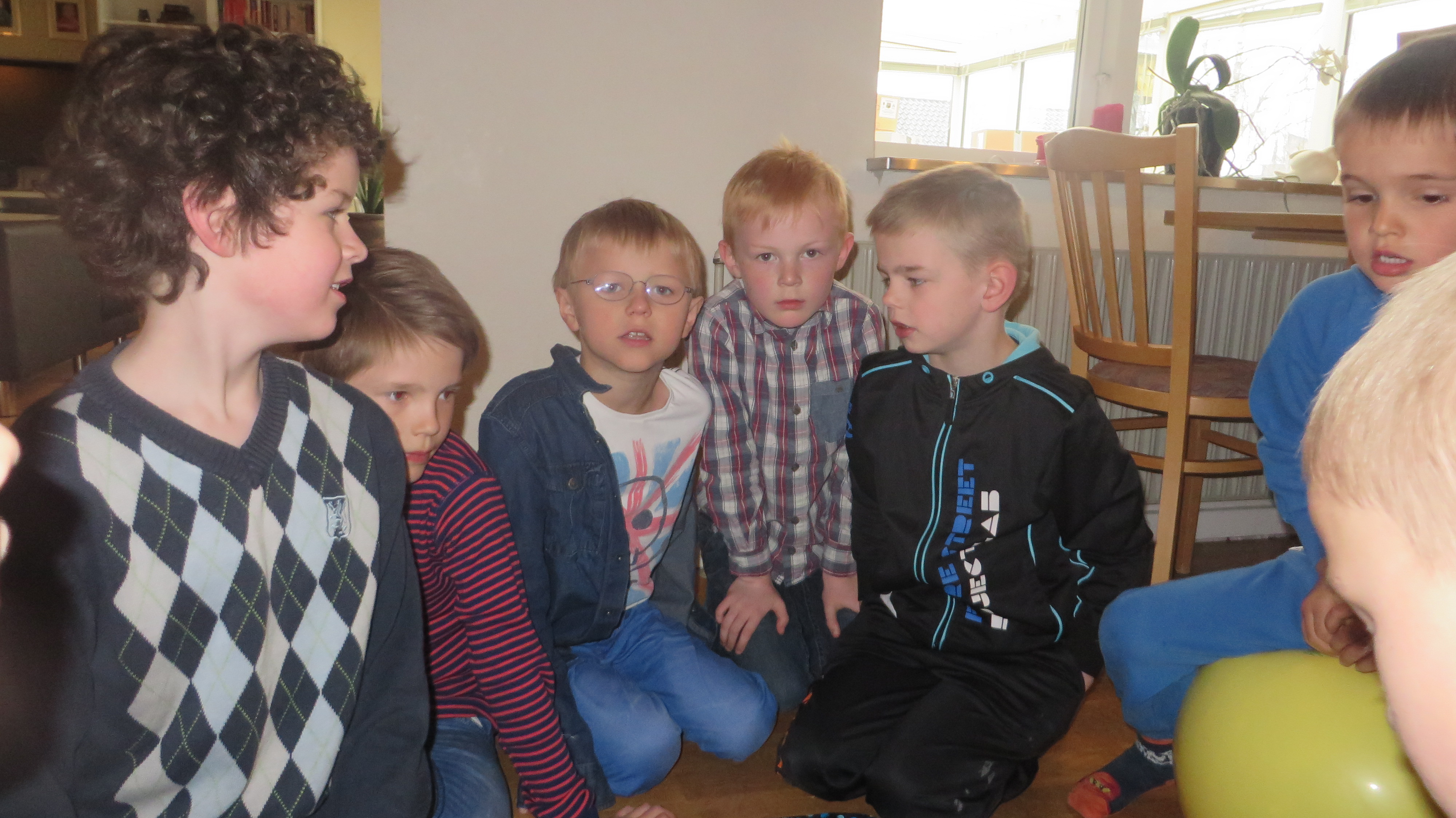 Her sidder de og kigger på at jeg pakker gaver op. Det er Thomas, Christian E, Malthe, Daniel og Bertram.Billedet er taget Saturday, April 5, 2014 12:37 PM.