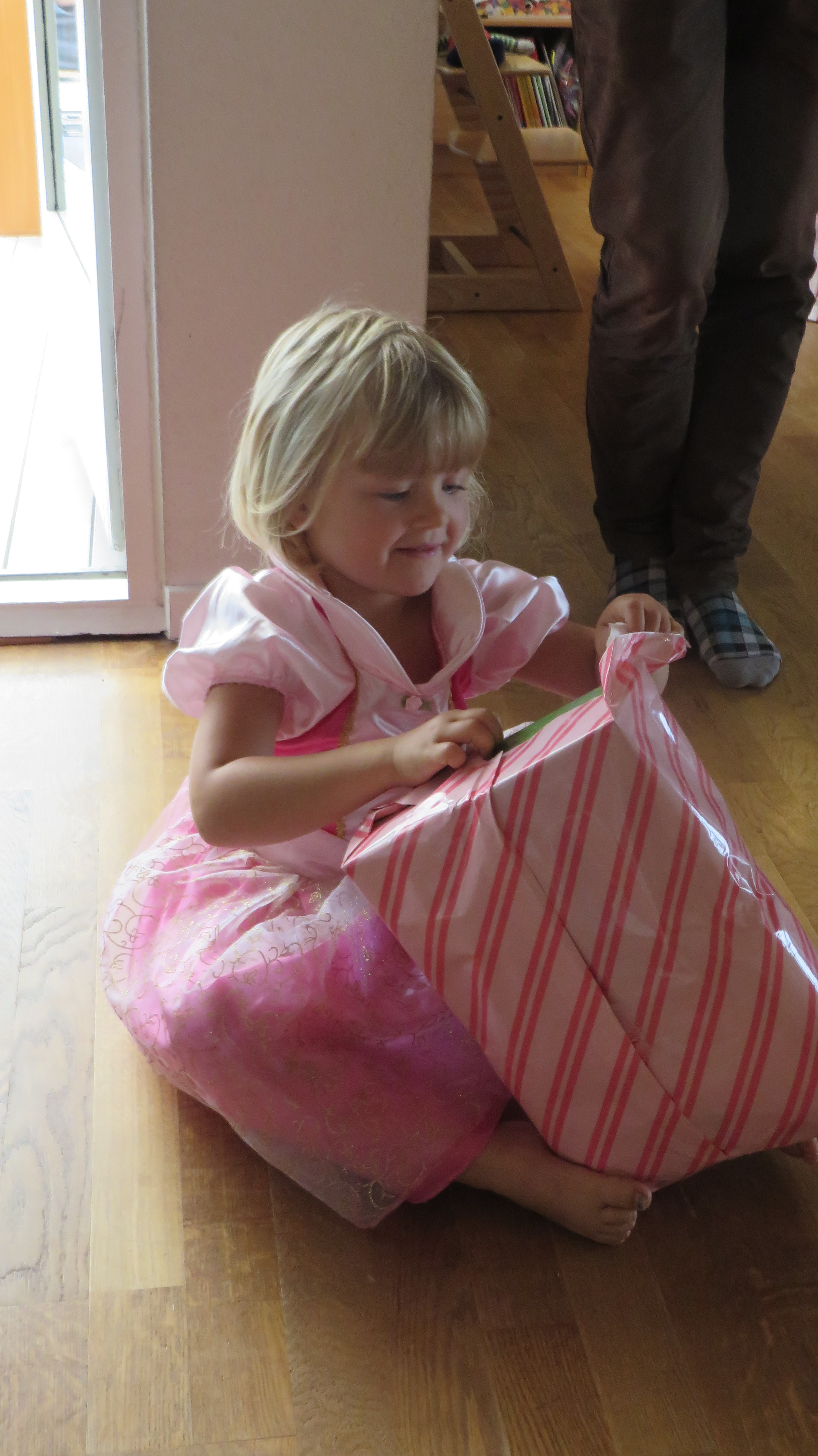 Senere bringer flere gæster flere gaver. Her er der en bamsekat fra farmor og farfar der er god at have med på lange køreture.Billedet er taget Sunday, September 7, 2014 12:14 PM.