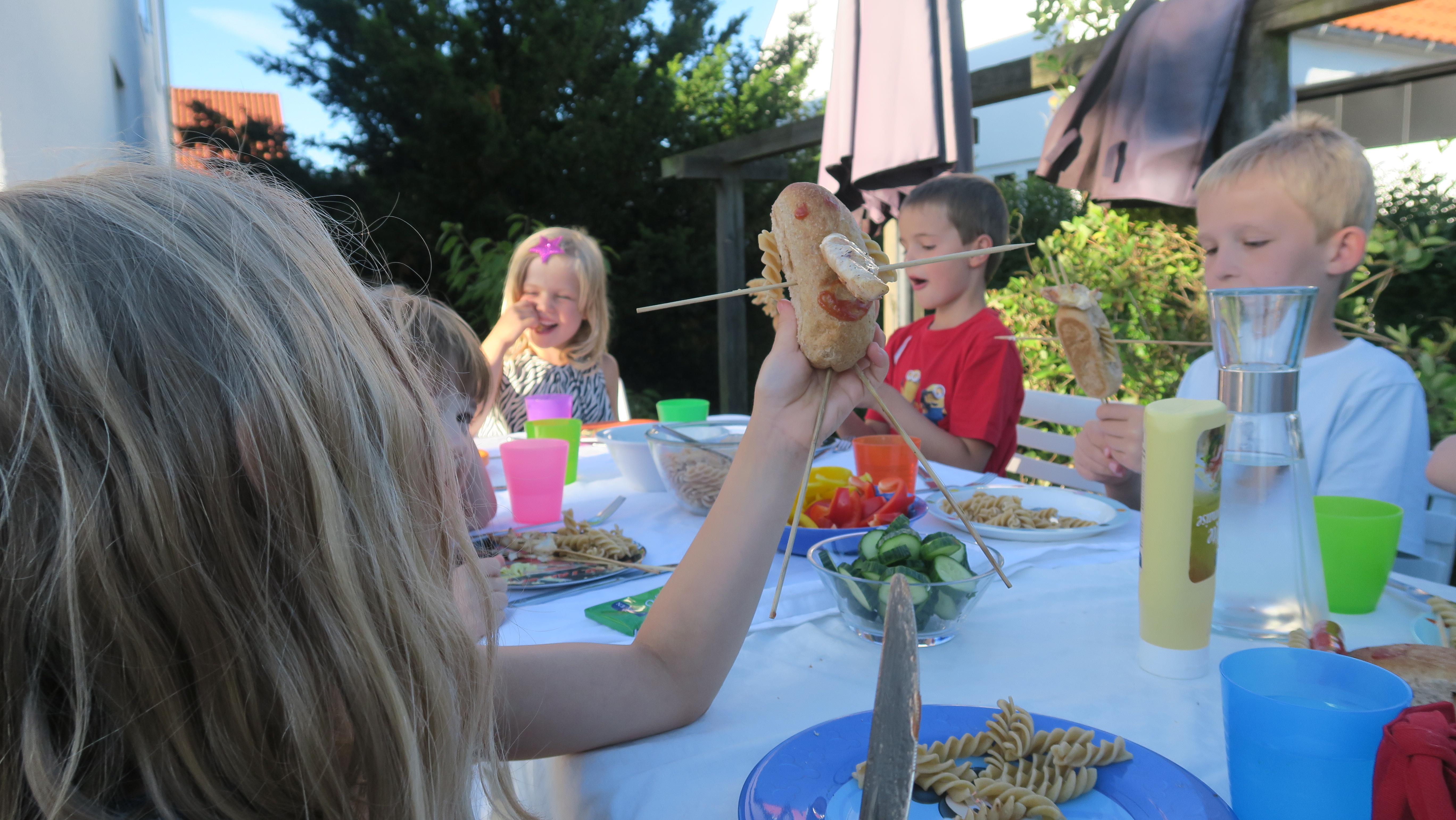 Fra aftensmaden blev der pinde til overs fra kyllingespydene. Disse blev hurtigt til arme og ben på brødene.Billedet er taget Wednesday, July 20, 2016 6:35 PM.