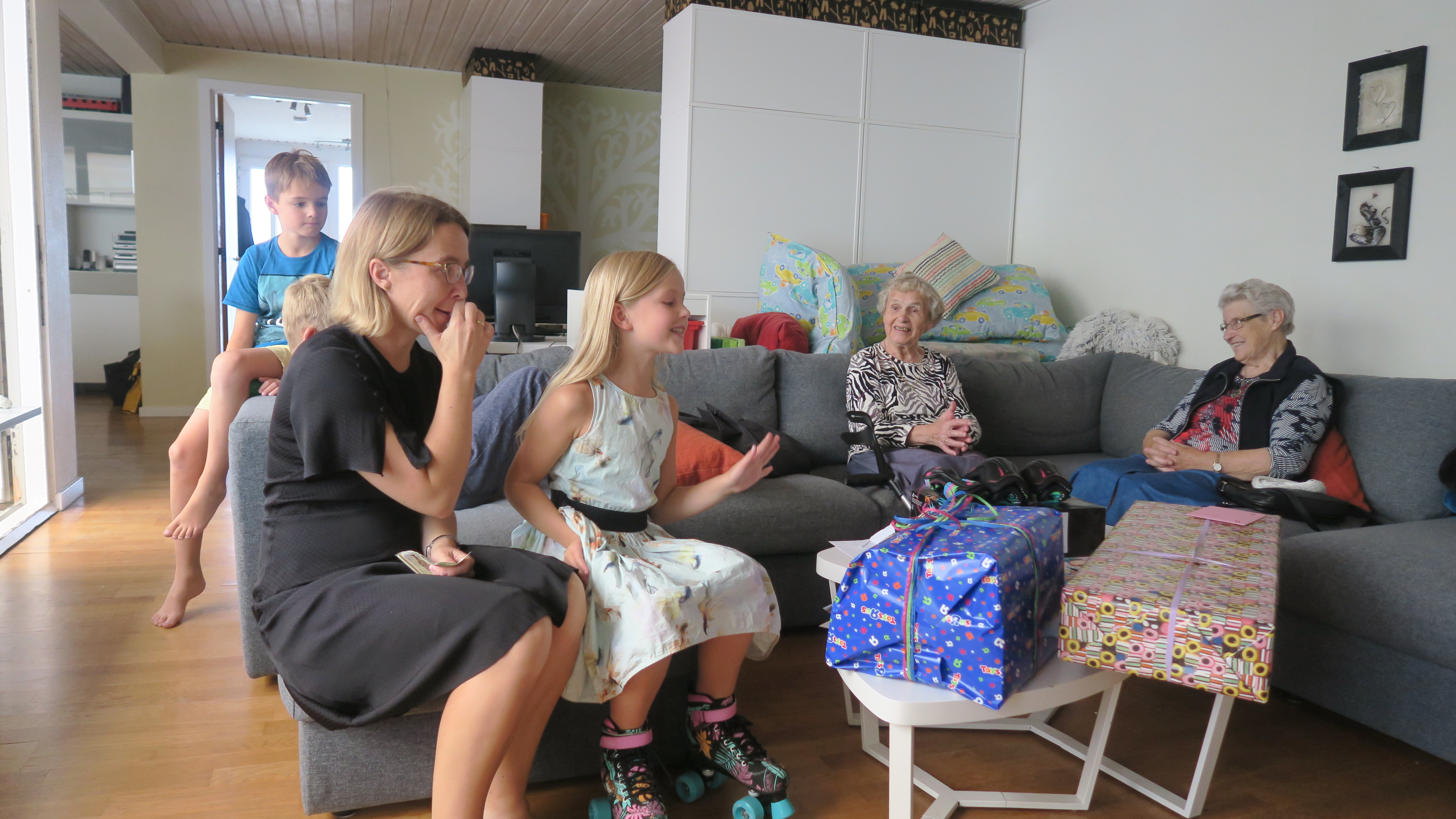 Her er den glade fødselar klar til at pakke gaver op iført nye rulleskøjter.Billedet er taget Sunday, September 2, 2018 1:38 PM.