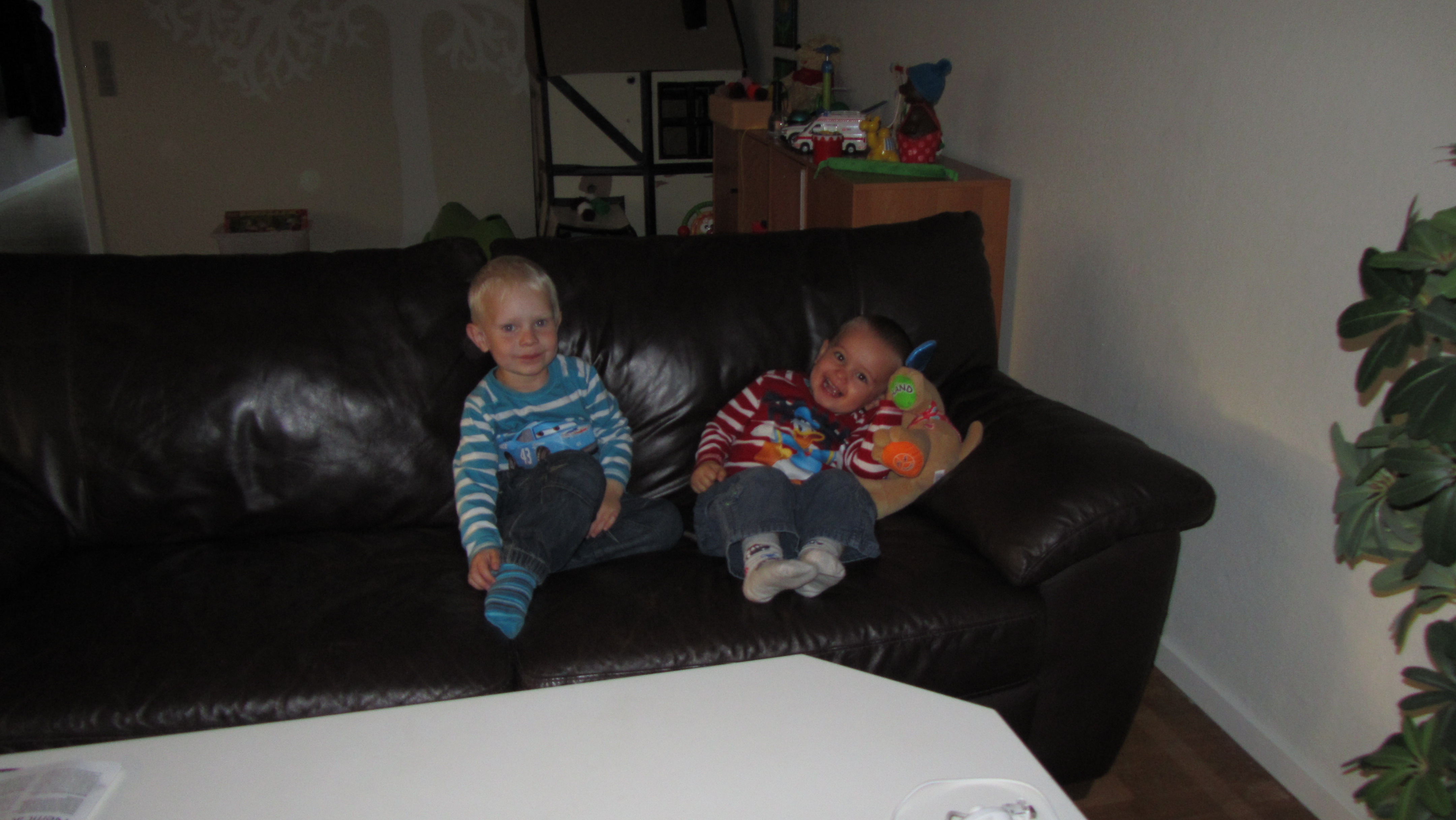 Andreas og jeg slappede af med de sidste minutters Playhouse Disney inde de voksne havde taget opvasken (efter pizza).