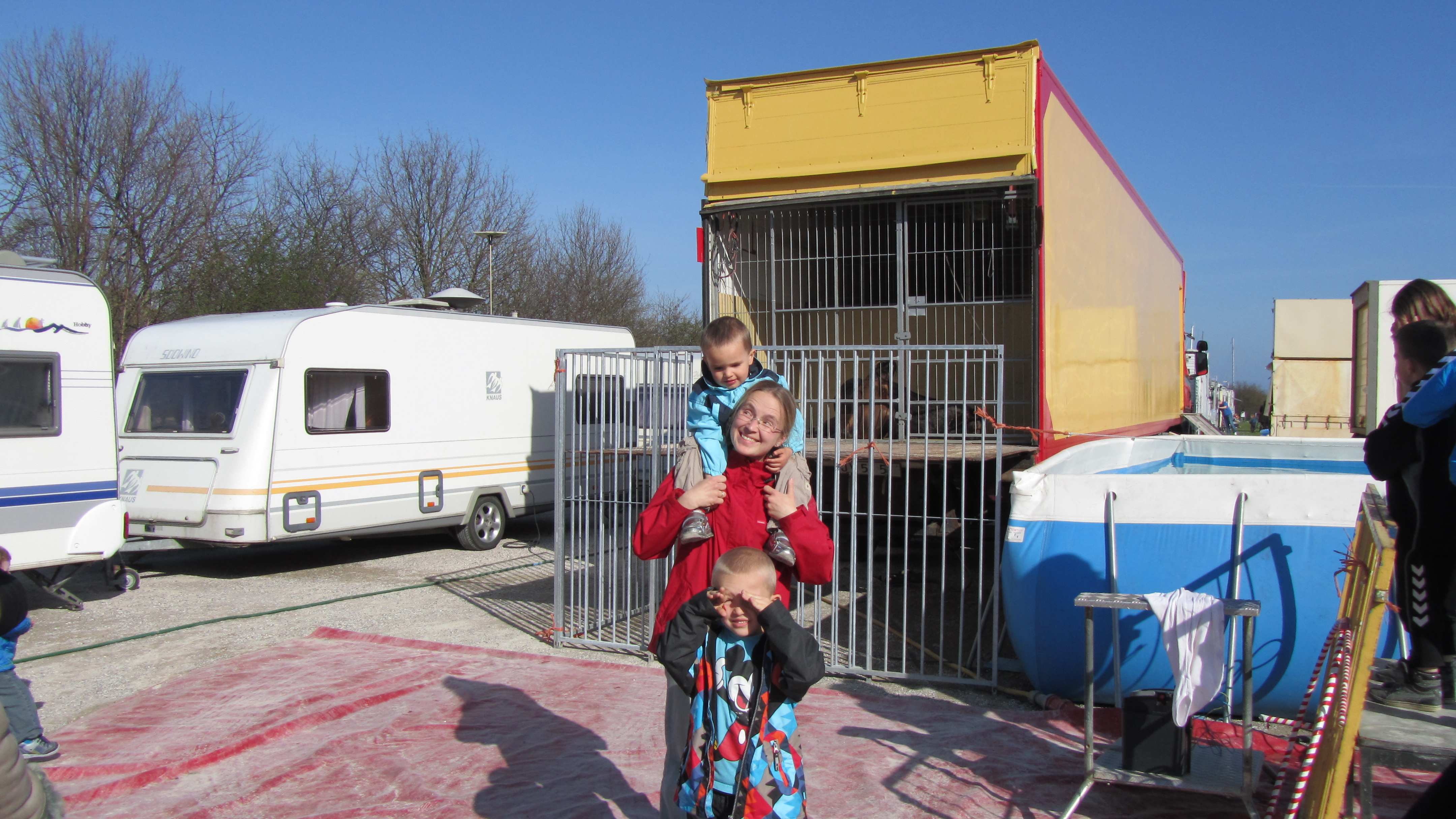På vej hjem var vi lige forbi cirkuset og se nogle af dyrene. Her er vi foran søløverne.