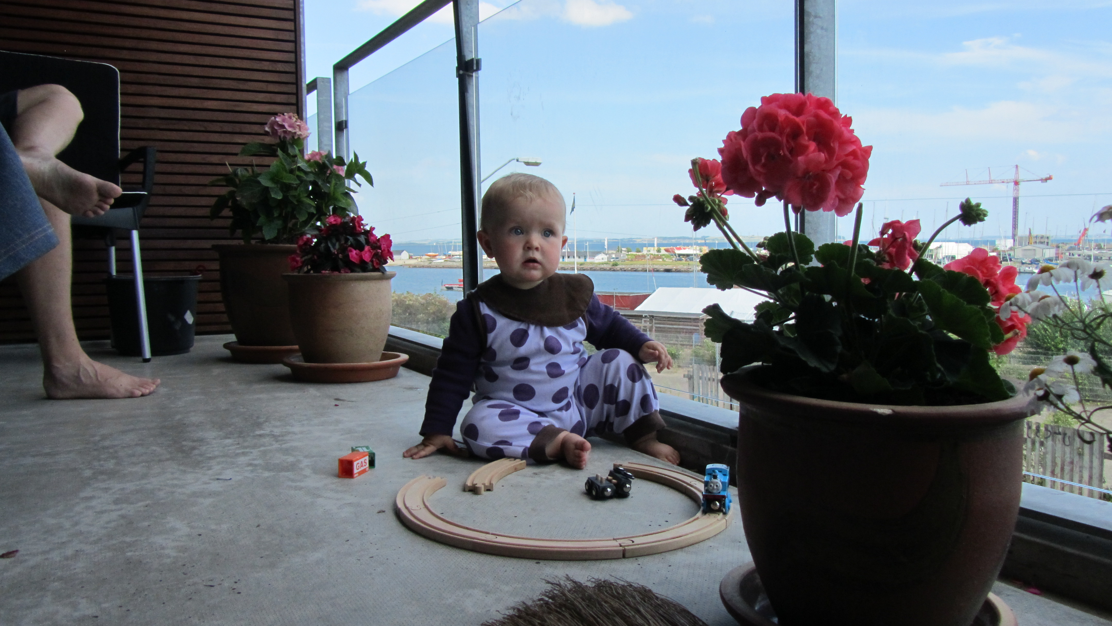 På altanen nyder Laura udsigten og kigger til en lidt størrer dreng lige inde ved naboen.Billedet er taget Sunday, July 10, 2011 4:14 PM.